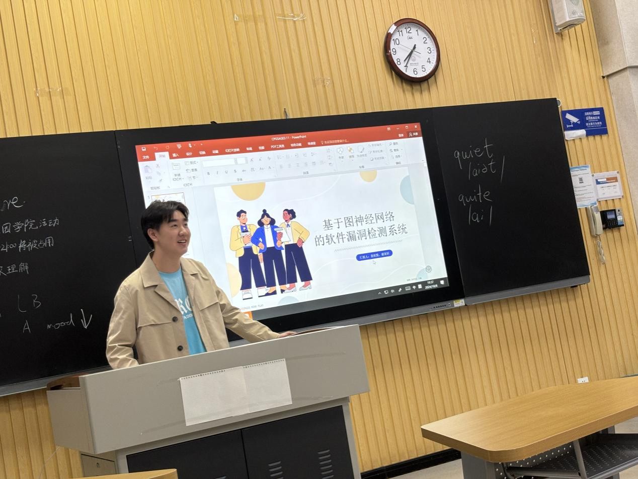 常祖铭同学向同学们回顾了自己的信息安全作品赛的参赛、获奖经历,分享了包括联系指导老师、组建竞赛队伍、确定课题方向等方面的见解,从实际情况出发,为大家分析参加信安作品赛的优势。他鼓励大家积极参赛,在备战信息安全作品赛的过程中学习更多相关知识,锻炼团队合作、学习实践的能力。在相关经验分享后,同学们受益良多,对信息安全作品赛有了更多了解,他们也积极地与学长进行交流,活动现场气氛热烈。