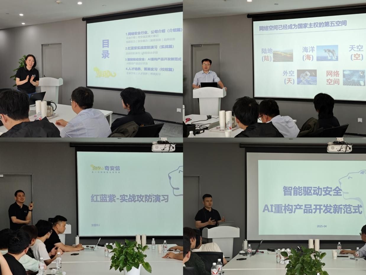 在座谈环节,何浩亮分享了奇安信在网络安全领域的发展大事记,分析了当前严峻的网络安全形势,强调网络空间已成为国家主权的第五大空间,呼吁同学们重视网络安全教育与实践。随后,耿浩杰为同学们讲解了红蓝紫实战攻防演习的相关知识,深入探讨了攻防演习的实施方法、主要攻击手段及防御策略,帮助同学们理解网络安全的实战维度与挑战。马刚伟则聚焦于“智能驱动安全”主题,探讨了如何在产品开发中合理运用AI技术,提升工作效率;同时分析了AI技术带来的机遇与挑战,激励同学们在快速发展的技术浪潮中不断学习与适应。