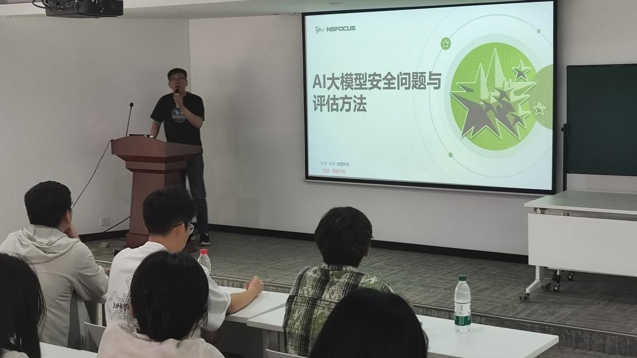 座谈交流环节中,公司人力资源经理李绒为大家介绍了公司的概况。她介绍道,绿盟科技拥有多个专业部门,涵盖安全研究、产品研发、市场营销等多个领域,各部门紧密协作,共同为网络安全事业保驾护航。绿盟科技集团股份有限公司西安分公司AI安全技术总监谭福超为师生们介绍了“AI大模型安全问题与评估方法”。他介绍道,随着AI技术在各行业的广泛应用,安全问题频发,严重威胁AI系统的可靠性与安全性。相比于传统的事后补救模式,将安全考量前置到AI训练、开发的早期阶段,从源头构建安全防线,能够更好地减少后期漏洞修复成本与安全隐患。最后,专家为师生们现场展示了绿盟科技的最新项目研究——“大模型安全测评平台”,让师生们对AI大模型安全有了更深刻认知。
