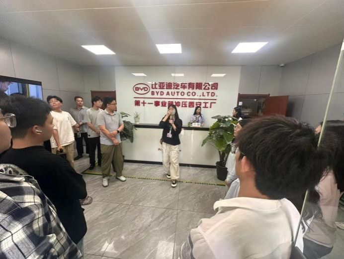 在比亚迪工作人员的带领下,师生们走进整洁有序的生产车间,近距离观摩了现代化汽车制造流水线的各个关键环节。讲解员细致生动地介绍了各类工序的流程、自动化设备的运行机制以及比亚迪在新能源车制造领域的技术成果,使同学们对新能源汽车的生产过程有了直观而深入的了解。