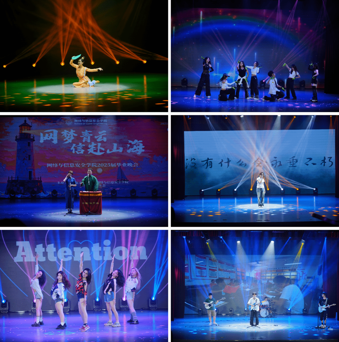 本次晚会一共12个节目,涵盖了舞蹈、话剧、歌曲、相声、配音等多个领域。这些节目展现了网信学子昂扬的精神面貌,更为2025届毕业生留下了珍贵的校园记忆。最后,晚会在《当一切结束时》燃爆全场的演绎中缓缓落幕。