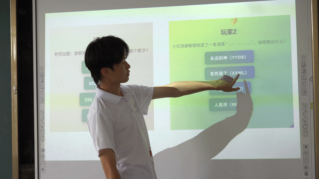 “滴—答—滴”,在充满趣味与挑战的课堂上,孩子们的眼神中闪烁着好奇与兴奋。支教队员化身知识引路人,带领孩子们走进神奇的摩斯密码世界。从简单的点划组合规则,到实际的信息编码与解码练习,孩子们全神贯注,积极思考,用稚嫩的小手在纸上认真地记录着每一个密码符号。当他们成功破译出隐藏在密码中的信息时,脸上洋溢着自豪的笑容,仿佛自己成为了神秘的通信大师。这一课程不仅让孩子们了解到一种独特的通信方式,更激发了他们对信息科学领域的探索欲望。
