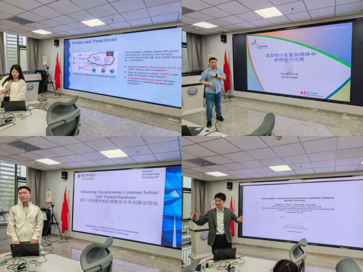 会上六位青年学者分别以《状态估计在复杂网络中的挑战与应用》《区块链共识算法攻击研究》《大语言模型基于条件发掘的消歧问答》《5G定位及其生态系统的安全隐私保护》《面向软件工程的复杂网络系统中数学模型的构建与验证》《基于可信硬件的区块链异步共识算法优化》为题作了精彩的学术报告。参会师生围绕报告内容,踊跃提问,双方对相关问题进行深入探讨,思想交锋高潮迭起、精彩纷呈。