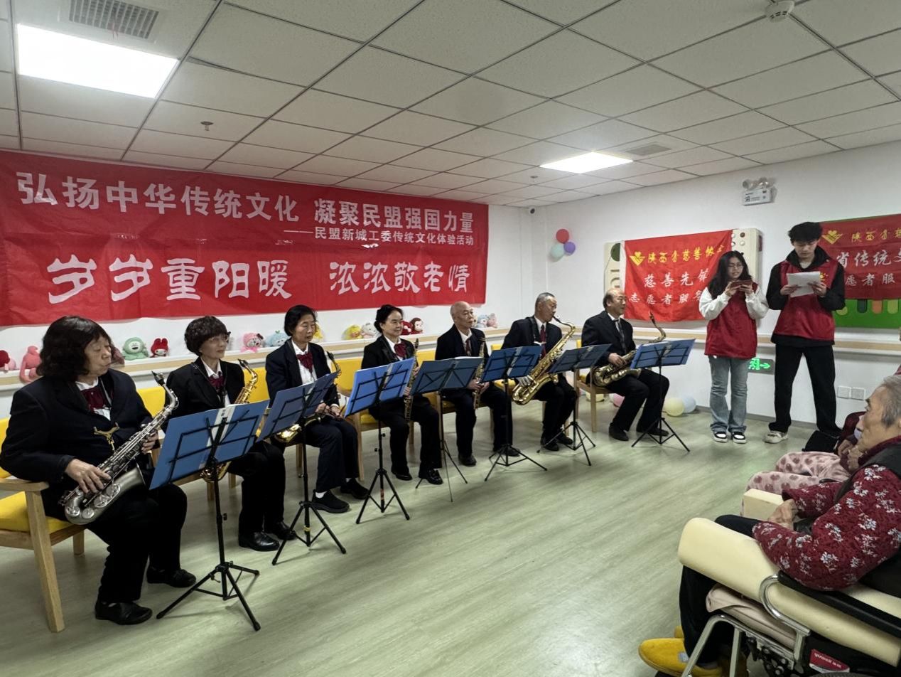 活动正式拉开帷幕,团支部的刘禹铭同学主动担当主持人。他身着整洁的志愿服,以亲切自然的话语和温暖真诚的笑容串联起活动全程,整个活动室充满着温馨的气氛。志愿者们带来合唱《夜空中最亮的星》,清亮嗓音交织在一起,点亮老人们的眼眸。当《东方红》《没有共产党就没有新中国》的旋律响起,现场掀起合唱热潮,老少同唱经典,熟悉曲调唤醒老人们的时代记忆,低沉哼唱中满是家国情怀。随后,平均年龄65岁以上的老年萨克斯演奏队登场,他们身着笔挺演出服,奏响《祝福祖国》《我们走在大路上》,醇厚音色与激昂节奏点燃气氛,台下老人或拍手或起身踱步,宛如跨越年龄的音乐盛会。