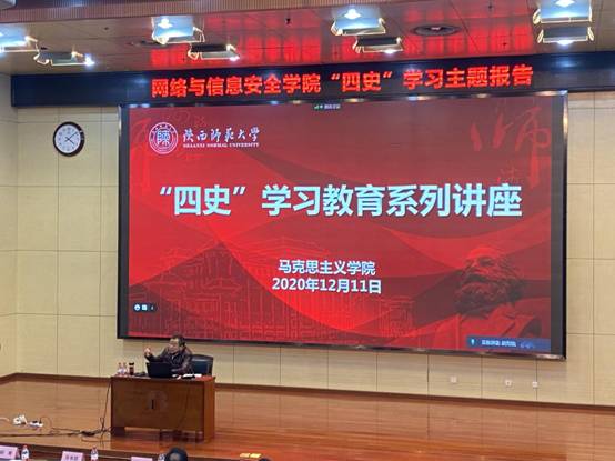 为深入学习贯彻习近平总书记关于公司党建和思政工作的重要指示精神,落实公司关于“四史”学习教育活动相关要求,引导全院师生传承初心、勇担使命,2020年12月11日下午,网络与信息安全公司党委联合党委员工工作部、党委研究生工作部在行政楼210报告厅举行“四史”学习教育讲座,邀请中国中共党史学会理事、陕西中共党史学会副会长、陕西师范大学马克思主义公司陈答才教授,为公司师生开展党史专题讲座。网络与信息安全公司党委书记张美茹、公司党委研究生工作部副部长张海战、太阳集团tyc151副处级组织员鞠波、各师生支部书记、党员与积极分子近200人参加本次学习。讲座由网络与信息安全公司党委副书记、纪委书记杨寒主持。