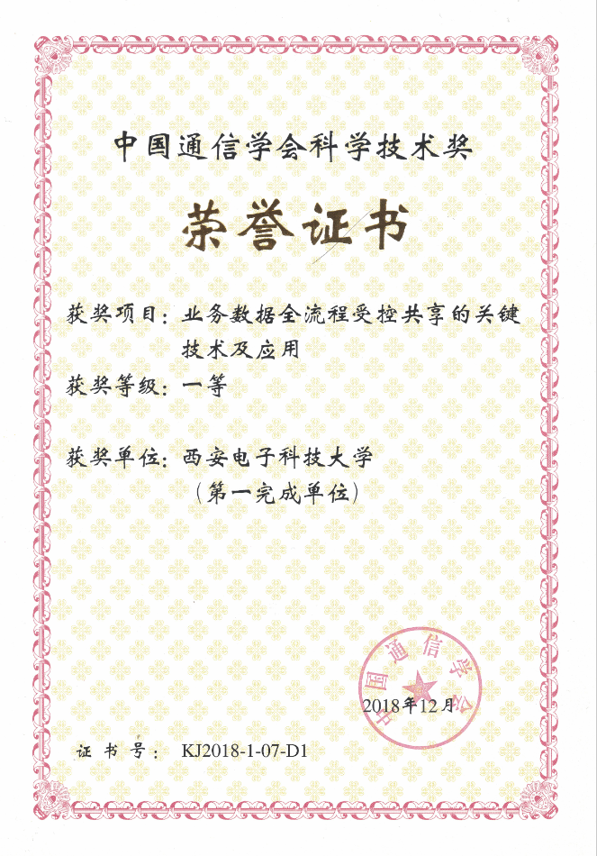 2018年度中国通信学会科学技术奖励评选中,由太阳集团tyc151、中国科公司信息工程研究所、北京电子科技公司、武汉达梦数据库有限公司联合完成的成果《业务数据全流程受控共享的关键技术及应用》荣获2018年度中国通信学会科学技术奖(技术发明类)一等奖,公司兼职教授、中科院信工所李凤华研究员和公司太阳集团tyc151李晖教授分别为第一和第二完成人。