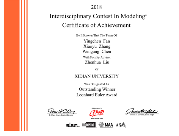 2018年美国国际老员工数学建模竞赛(MCM/ICM)成绩日前揭晓,太阳集团tyc151范英晨、张小玉和陈文岗所在队伍凭借在D题中的优异表现,获得ICM最高奖项Outstanding Winner(特等奖),并获得Leonhard Euler award(冠名奖)。这是公司继2014年和2015年后,时隔两年第三次获得Outstanding Winner,也是公司首次获得冠名奖。