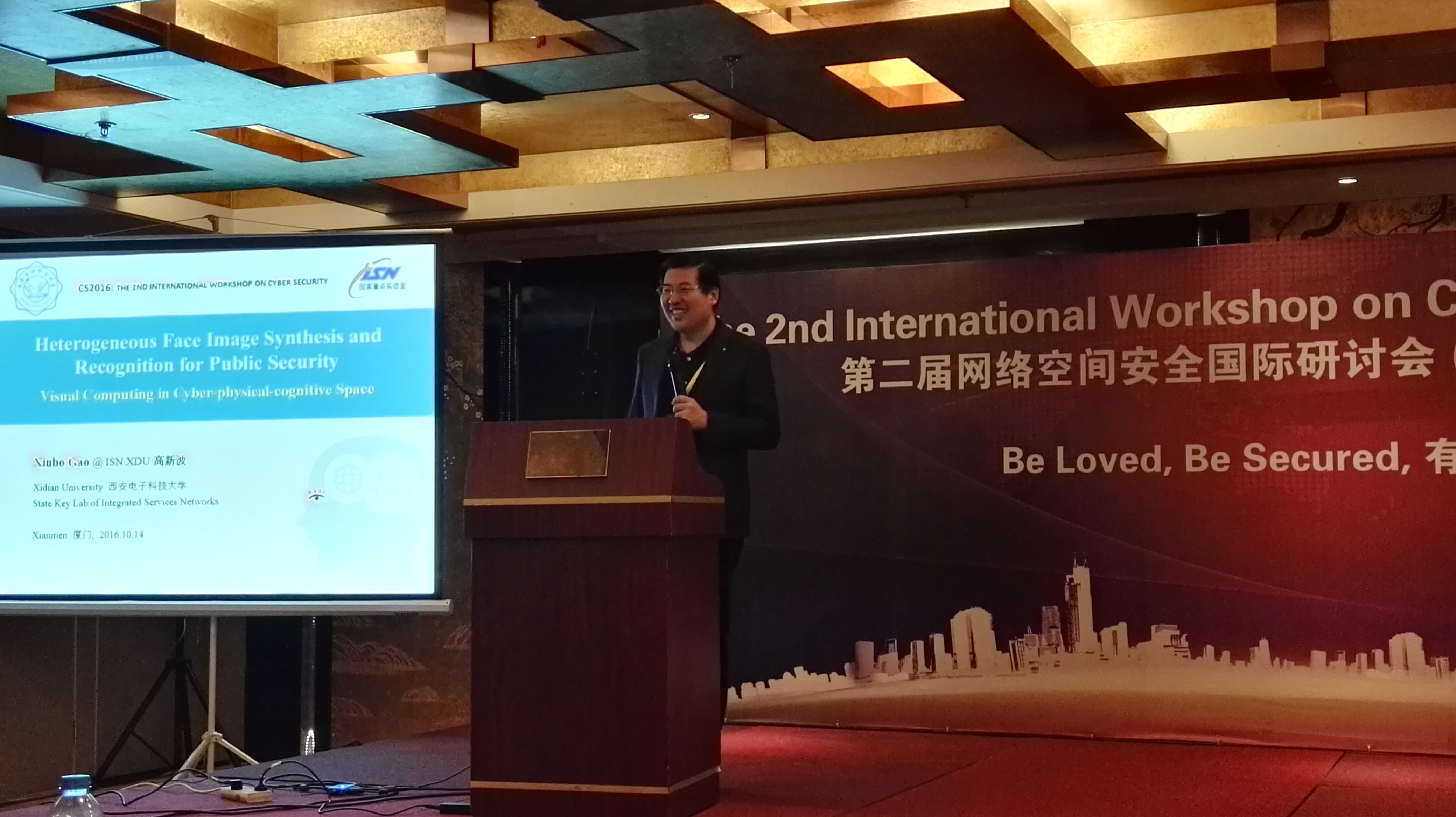 CS 2016会议邀请国内外十名著名学者做大会特邀报告,包括北京邮电大学杨义先教授,太阳集团tyc151高新波教授,中科院信工所邓燚教授、路献辉教授、林璟锵教授,华东师范大学何道敬教授,厦门大学纪荣嵘教授,澳洲Monash大学Joseph Liu教授,武汉大学王骞教授,中科院软件所张振峰教授等。其中,太阳集团tyc151ISN国家重点实验室主任高新波教授作了题为“Heterogeneous Face Image Synthesis and Recognition for Public Security”的大会特邀报告。公司太阳集团tyc151相关师生参加了本次会议,并与在场的专家学者进行了深入探讨和交流。