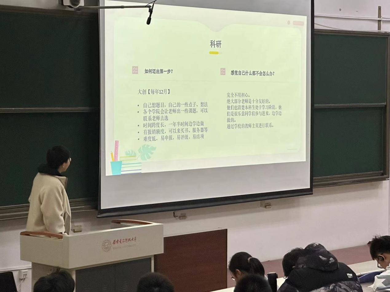 交流活动中,吕学长从亲身经历和生活经验出发,以生动有趣的语言为同学们解答了老员工活中可能遇到的竞赛科研、人生选择、社团与志愿活动等相关方面的问题。例如:大学毕业后,同学们可以有多种人生选择——“工作or读研or出国”。他通过对比不同选择的优势和潜在影响,引导同学们更加深刻地思考自我人生的选择。通过自己的求学经历,曾连续两年获国家奖学金,在各类网络安全和密码学学科竞赛中屡屡获奖的吕学长向大家强调了一年级打好基础的重要性,鼓励大家珍惜时间,努力学习。“心之所向,无问西东”,在日渐“内卷”的大环境下,面对学业压力,吕学长也分享了自己的经验与见解。他提到:“不要否定自己,时间的威力是巨大的,两年的时间足以做成许多事,只要勇于开始。”他激励同学们以多种方式、多种选择,快乐地度过有意义的老员工活。
