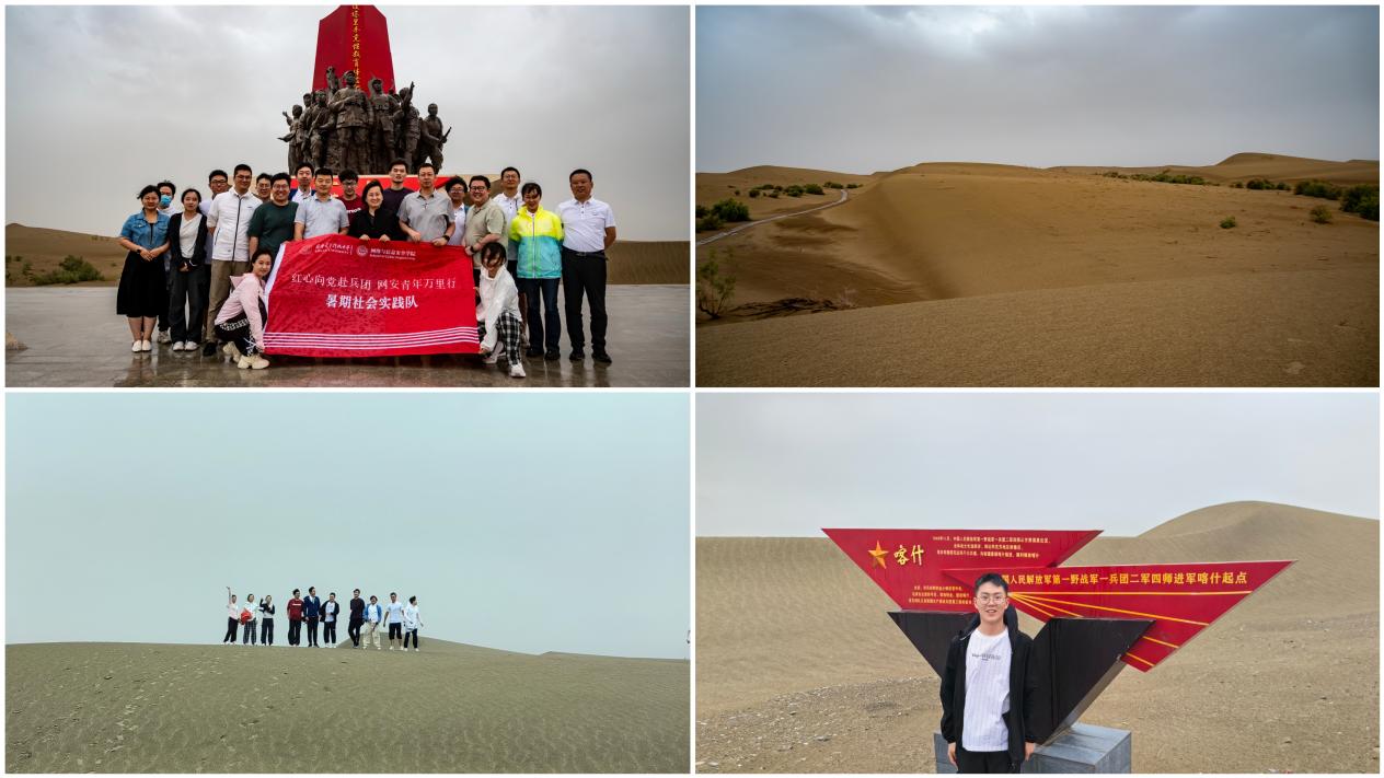 1949年,为了一道命令,沙海老兵徒步穿越塔克拉玛干沙漠,解放和田;1952年,沙海老兵就地转业,一手拿枪一手拿镐,开荒筑田、造桥修路、植树造林,将青春和汗水献给荒漠,凝聚成“扎根边疆、屯垦戍边、艰苦奋斗、无私奉献”的老兵精神。实践队员们来到阿拉尔市沙漠之门—塔克拉玛干景区,重走沙海老兵路,感悟沙海老兵“献了青春献终身,献了终身献子孙”的伟大奉献精神。