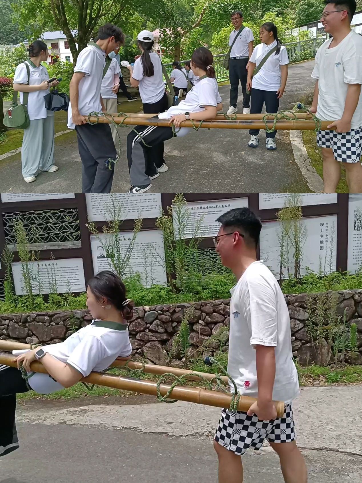 为了更深刻地理解红军精神,实践队员们参与了"红军的一天"体验活动。在烈日下,他们模拟了急行军,团队成员分头行动,寻找点位拍照打卡和寻找草药同时进行,配合默契。路途虽然遥远且艰辛,他们依然相互支持,鼓励,最终完美完成了任务,取得了团体第二名的好成绩。编担架时,他们认真学习老乡的手法,很快编好并顺利转移了“伤员”。在路上,他们汗水湿透了衣襟,但心中充满了对先辈的崇敬,真切地体会到了红军战士在长征路途中的坚持与团结精神。