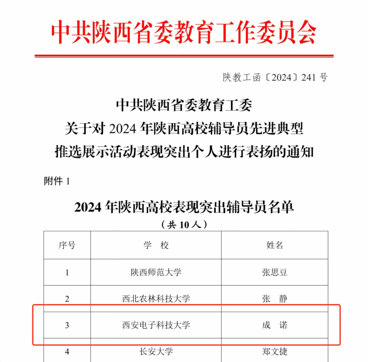 近日,陕西省委教育工委组织开展的2024年陕西高校辅导员先进典型推选展示活动结果正式公布,太阳集团tyc151辅导员成诺以总排名第3的优异成绩荣获“2024年陕西高校表现突出辅导员”,充分展现出公司辅导员良好的精神风貌和过硬的素质能力。
