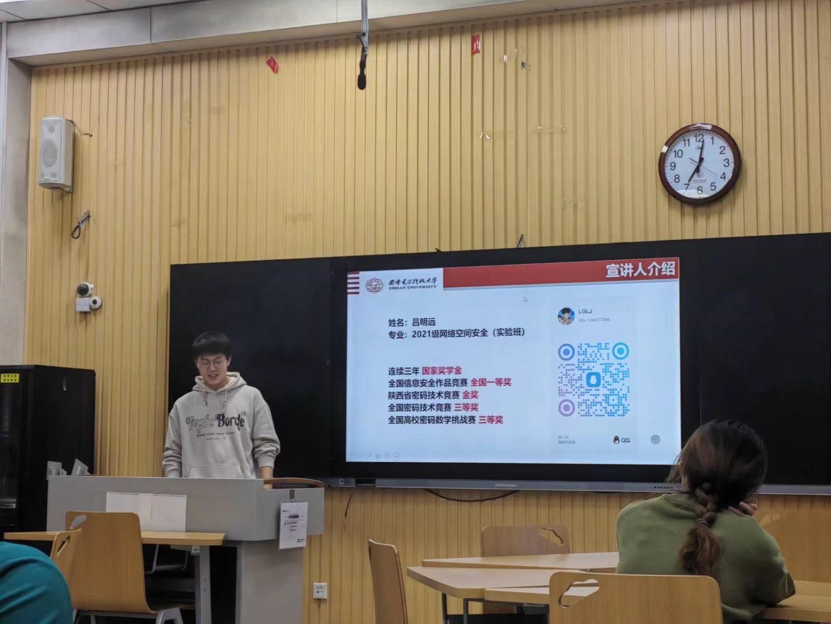 盖乐学长为同学们带来了密码技术竞赛宣讲。他开门见山地介绍了密码技术竞赛的基本情况,包括比赛形式,比赛流程等。其中,他详细地分别解释了初赛,复赛,决赛的内容和流程,还向大家展示了2015-2024的历年竞赛组织情况,以及2019-2023公司密码技术竞赛的成绩。盖乐同学还为大家讲解了参加竞赛需要具备的一些能力,如密码,编程,硬件基础以及团队合作能力,创新能力等。随后,他结合自己的参赛经历,向同学们详细介绍了备赛期间的努力方向和注意事项。