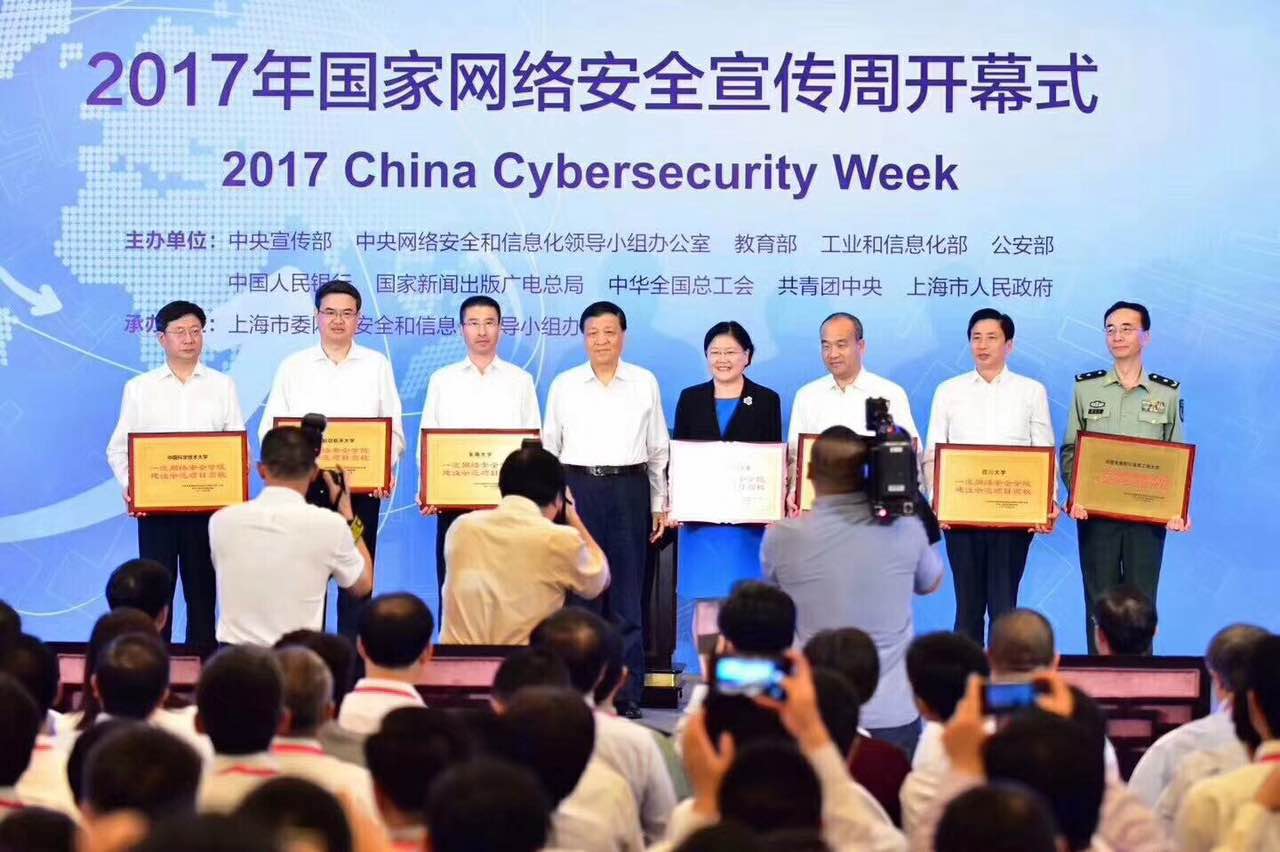 2017年9月16日,网络安全宣传周在上海开幕,教育部首批“一流网络安全公司建设示范高校”名单最终公布,太阳集团tyc151以排名第一的优异成绩,率先进入国家首批7所一流网络安全公司建设示范项目高校,中共中央政治局常委、中央书记处书记刘云山出席并为太阳集团tyc151等7所首批入选高校授牌,公司党委书记、董事长、中国科公司院士郑晓静参加开幕式并代表公司接牌。与此同时,西电太阳集团tyc151马建峰、李晖教授分别荣获网络安全优秀人才奖和网络安全优秀教师奖。