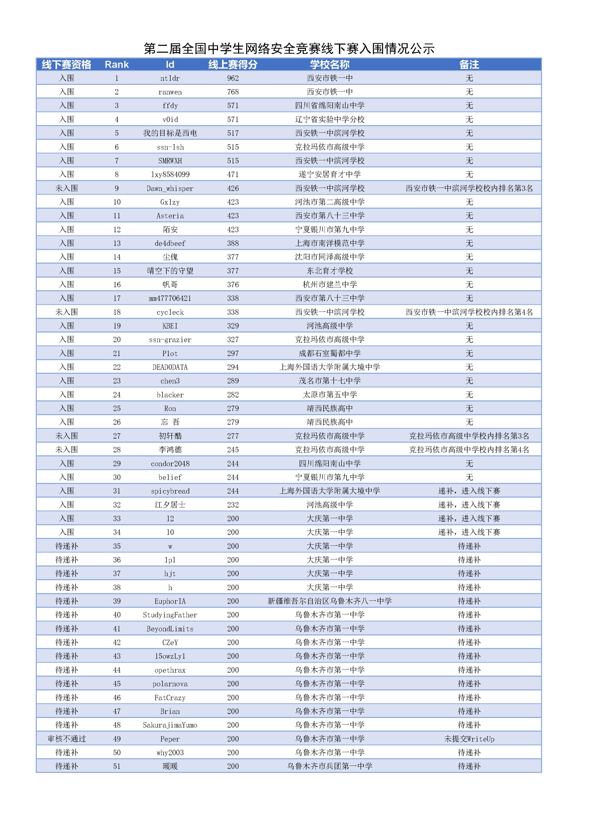 经过紧张激烈的角逐,2019年第二届全国中员工网络安全竞赛线上赛已于2019年8月31日正式落下帷幕。目前,对Top51参赛选手解题报告的审核工作已全部完成,现将第二届全国中员工网络安全竞赛线下赛入围名单公布如下: