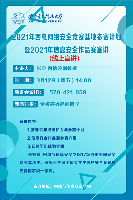定于3月12日(周五)下午14:00,面向全校员工组织2021年西电网络安全竞赛基地参赛计划暨2021年信息安全作品赛宣讲会,请各位同学积极参加哦!!!